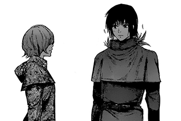 Several years past their fight in the 11th ward, Ayato has grown to be a good-looking man taller and stronger, even the CCG has recognized him as an SS-rate ghoul. He’s able to manipulate his ukaku to take a form of koukaku, which allows him to fight better in close-range combat. He unexpectedly reunites with his sister when they’re in Cochlea, while trying to save Hinami. Touka and Yomo save him while being attacked by the investigators. Ayato is upset by their presence, but Touka says not to worry about her.