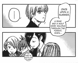 Kaneki finds out early about Touka’s pregnancy (thanks to Nishiki’s blunder), eventhough she is trying to hide it. Sometime later, Kaneki helps the orphan ghouls to find Touka—he’s not avoiding her, which is a sign that he doesn’t hate the idea of being a father. He’s just pondering if she’s still mad that he’s looked at the calendar. I am fascinated by how he observes Touka reading the picture books to the ghoul kids—could it be that he’s imagining her doing the same to his child?