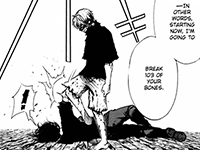 Kaneki is able to see through Ayato, that he attacks Touka out of love, in order to protect her (tough love, duh). Ayato keeps denying this, but then he is distraught and remembers a fragment of his memories of little Touka crying; her clothes ripped by the kagune that came out of her back—which indicates that he does care about her. Despite knowing this, Kaneki doesn’t hesitate to half-kill him, breaking half of his total bones in cold blood while reciting the names and amounts of the bones. Kaneki considers this act as a mercy, because Touka loves her only brother and she will be upset if he kills Ayato.